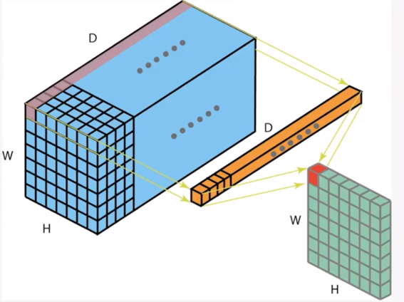 위 그림에서는 3개의 channel에서 3개의 Convolutional Filter를 사용하여 multiplication을 하고 그 결과를 모두 합하는 행위를 한다.