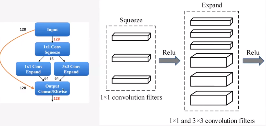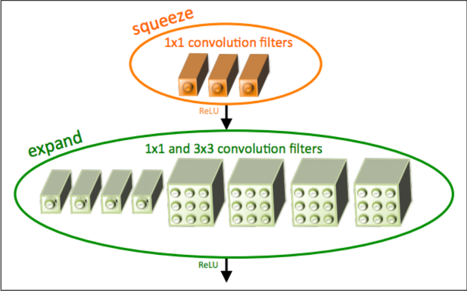 SqueezeNet에서 Squeeze Layer는 1 x 1 Convolutional Filter를 통해 채널을 압축하고, Expand Layer에서 1 x 1 Convolutional Filter와 3 x 3 Convolutional Filter를 통해 다시 팽창시켜주는 역할을 한다.