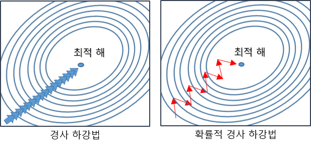 확률적 경사 하강법(SGD)는 경사하강법과는 다르게 한 번 학습할 때 모든 데이터에 대해 가중치를 조절하는 것이 아니라, 임의로 추출한 일부 데이터에 대해서만 가중치를 조절한다. 결과적으로 속도는 개선되었지만 최적해의 정확도는 낮게된다.