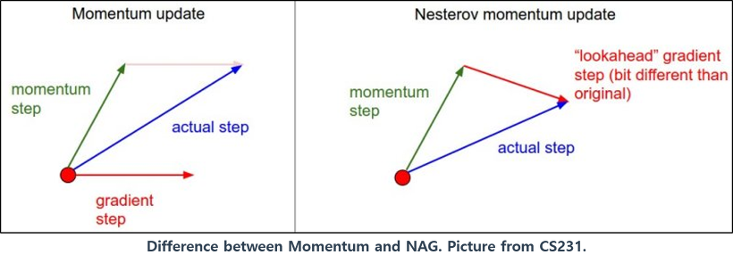 Nesterov Accelerated Gradient를 추가함으로써 V(t)를 계산하기 전 Momentum 방식으로 인해 이동될 방향을 미리 예측하고 해당 방향으로 얼마간 미리 이동한 뒤 Gradient를 계산하게 되므로, 불필요한 이동을 줄여 Accuracy를 높일 수 있다.