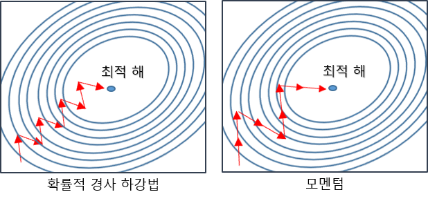 SGD에 Momentum을 추가하게 되면, 경사하강법과 마찬가지로 매번 기울기를 구하지만, 가중치를 수정하기 전 수정 방향(±)를 참고하여 같은 방향으로 일정한 비율만 수정되기 한다.