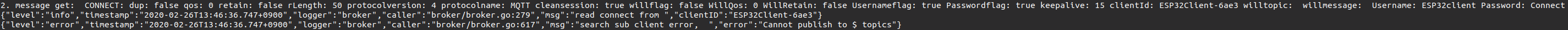 {"level":"info","timestamp":"2020-02-26T13:46:36.747+0900","logger":"broker","caller":"broker/broker.go:279","msg":"read connect from ","clientID":"ESP32Client-6ae3"}