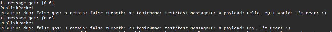 1번 메시지를 통해 MQTT 메시지의 Type은 무엇인지(위의 경우 PublishPacket), QoS는 몇인지(위의 경우 0), 발행자가 어느 토픽에 글을 발행했는지(위의 경우 test/test), 메시지 본문은 무엇인지(위의 경우 Hello, MQTT World! I'm Bear! :) 와 Hey, I'm Bear! :))에 대해 알 수 있다.