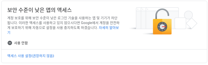 # "보안 수준이 낮은 앱 허용"을 "활성화"로 바꿔주셔야 합니다.