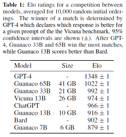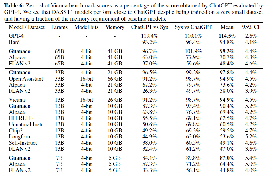 - Vicuna 벤치마크 결과는 위 표에서 ChatGPT와 관련하여 표시됩니다. Guanaco 65B는 GPT-4 다음으로 최고의 성능을 발휘하는 모델로 나타났으며, ChatGPT에 대한 성능이 99.3%에 달합니다.