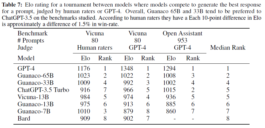 - 가장 경쟁력 있는 모델의 Elo 평가는 Guanaco 33B와 65B 모델이 Vicuna 및 OA 벤치마크에서 GPT-4를 제외한 모든 모델보다 우수하다는 것을 나타냅니다.