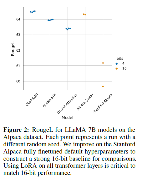 - 이 논문은 QLoRA를 소개하며, 이는 메모리 사용량을 줄이기 위해 설계된 효율적인 미세조정 방법입니다. 이 방법을 사용하면 65B 파라미터 모델을 단일 48GB GPU에서 16비트 미세조정 작업 성능을 유지하면서 미세조정할 수 있습니다.