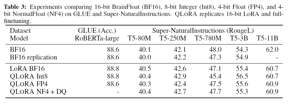 - 저자들은 또한 QLoRA의 구성 요소, 특히 NormalFloat4가 표준 Float4보다 어떤 영향을 미치는지 분석하려고 합니다.
