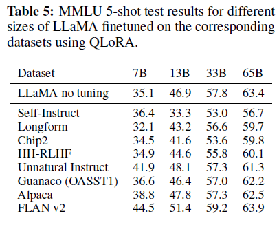 - 결과는 QLoRA 미세조정이 작은 고품질 데이터셋에서도 이전 SoTA보다 작은 모델로도 최신 기술 결과를 가져올 수 있음을 나타냅니다.