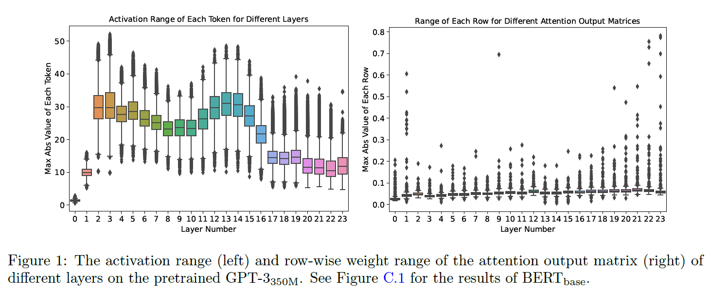 - 이러한 방법은 활성화 범위의 변동이 작은 소규모 모델에는 충분할 수 있습니다. 그러나 GPT-3350M 및 BERTbase와 같은 대규모 트랜스포머 모델에는 활성화 범위에서 큰 변동이 있습니다.