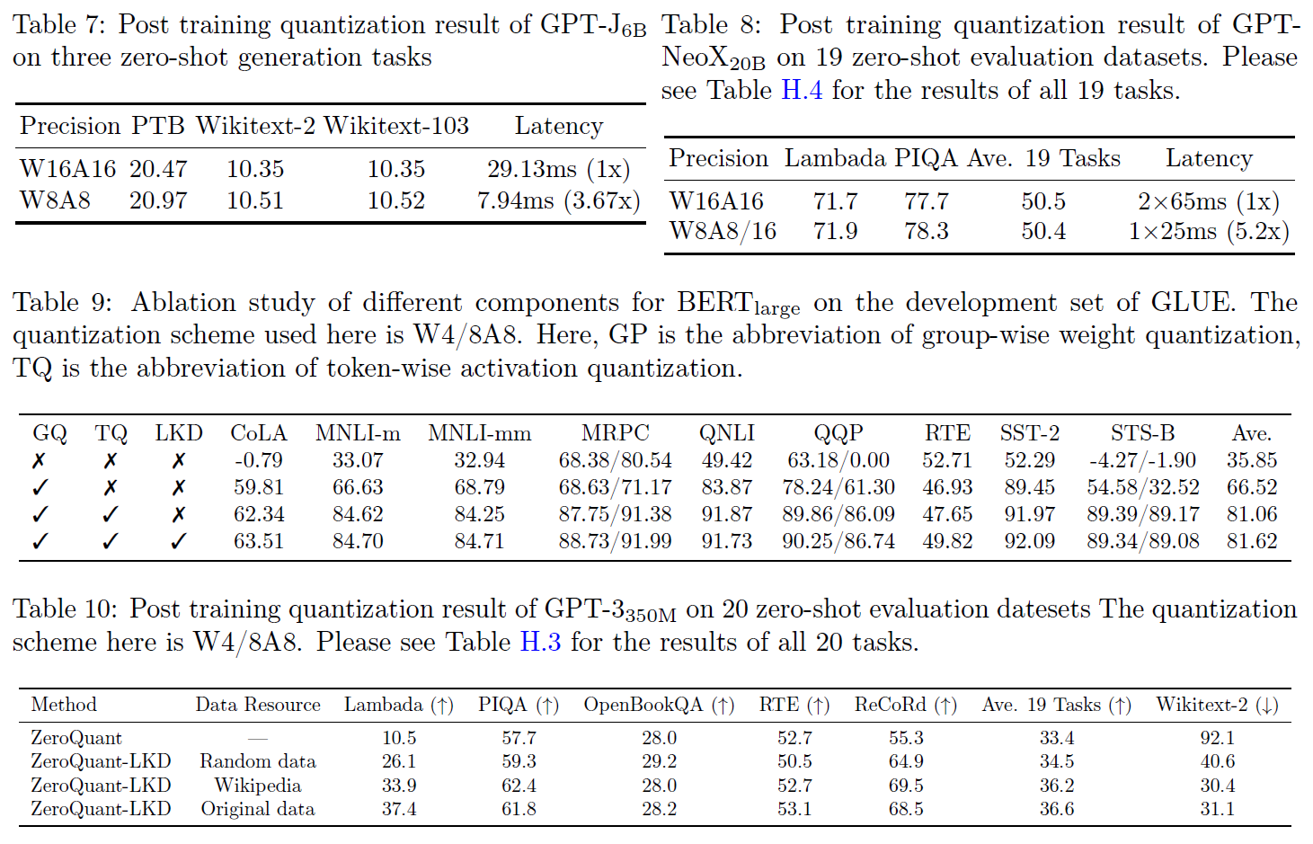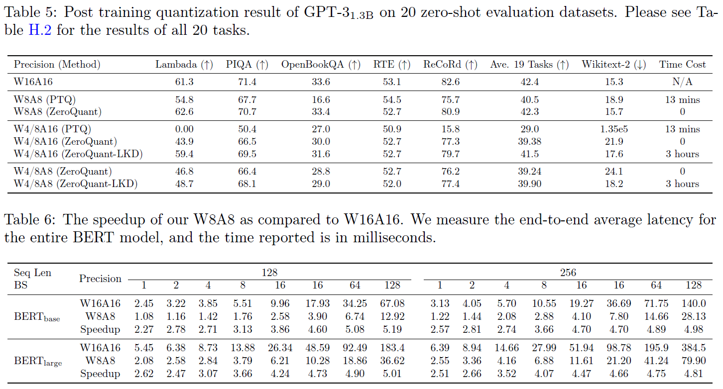 - 본 논문은 ZeroQuant가 다음과 같은 성과를 낼 수 있다고 주장합니다: