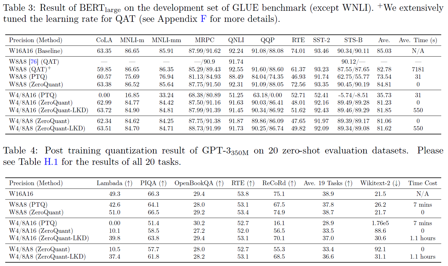 - 또한 활성화 범위를 보정할 필요가 없기 때문에, 추후 ZeroQuant에 대해서 활성화 범위 보정과 같은 양자화 관련 비용이 없다는 것을 보여줄 것입니다(예: INT8 가중치와 INT8 활성화를 사용하는 중간 양자화 체계).