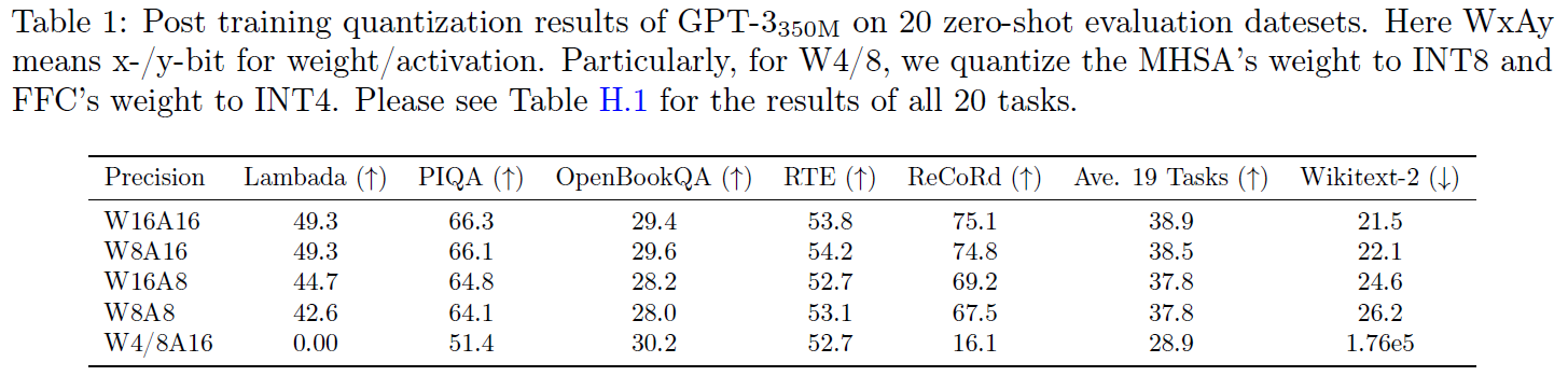 - BERT/GPT-3 스타일 모델에 INT8 PTQ를 적용하더라도 중요한 정확도 저하가 발생합니다.