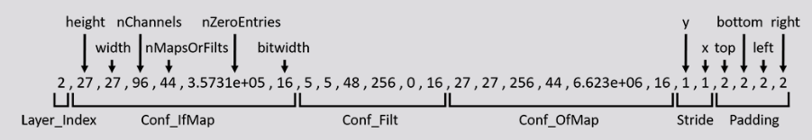 - Conf_IfMap, Conf_Filt, Conf_OfMap: 입력 피처 맵, 필터, 출력 피처 맵의 구성입니다. 세 데이터 유형의 구성은 "높이 너비 채널 수 맵 또는 필터 수 0 항목 수 비트 폭(비트)" 형식입니다.