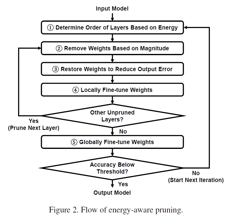 - 우리의 목표는 주어진 CNN의 에너지 소비를 필터를 희소화함으로써 줄이는 것이며, 네트워크의 정확도에 큰 영향을 미치지 않습니다. 제안된 에너지 인식 가지치기의 주요 단계는 Fig. 2에 나와 있으며, 입력은 CNN 모델이고 출력은 에너지 소비가 더 낮은 희소한 CNN 모델입니다.