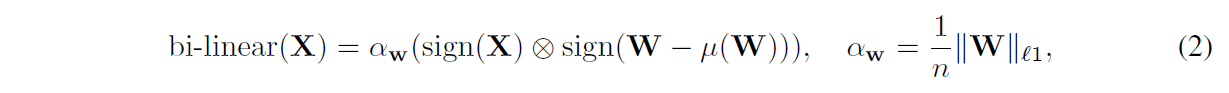 - 순전파에서는 sign 함수가 적용되며, 역전파에서는 straight-through estimator (STE) (Bengio et al., 2013)가 사용되어 미분값을 얻습니다. 이진화 선형 계층의 가중치에 대해서는, 일반적인 관행은 표현 정보를 유지하기 위해 가중치를 제로 평균으로 재분배하고 (Rastegari et al., 2016; Qin et al., 2020), 양자화 오류를 최소화하기 위해 스케일링 인자를 적용하는 것입니다 (Rastegari et al., 2016). 활성화는 계산 효율성을 위해 재스케일링 없이 sign으로 이진화됩니다. 따라서, 계산은 다음과 같이 표현될 수 있습니다: