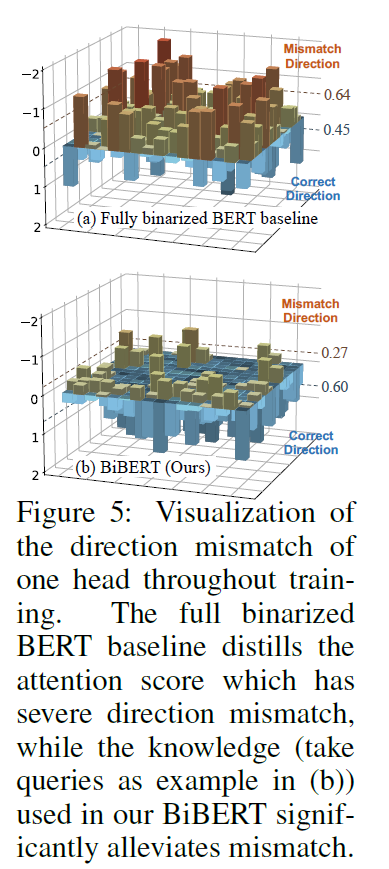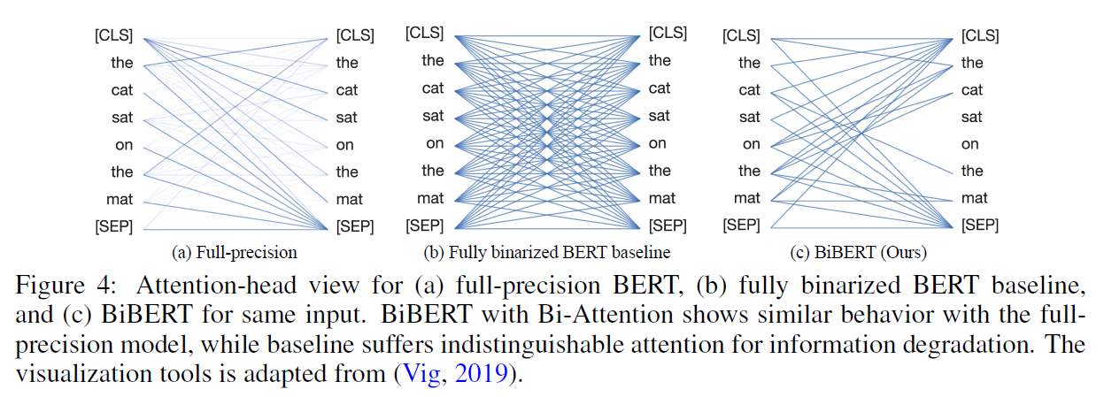 - 우리의 BiBERT는 처음으로 정확한 완전 이진화 BERT (1비트 가중치, 임베딩, 활성화)를 향한 유망한 경로를 제시합니다.