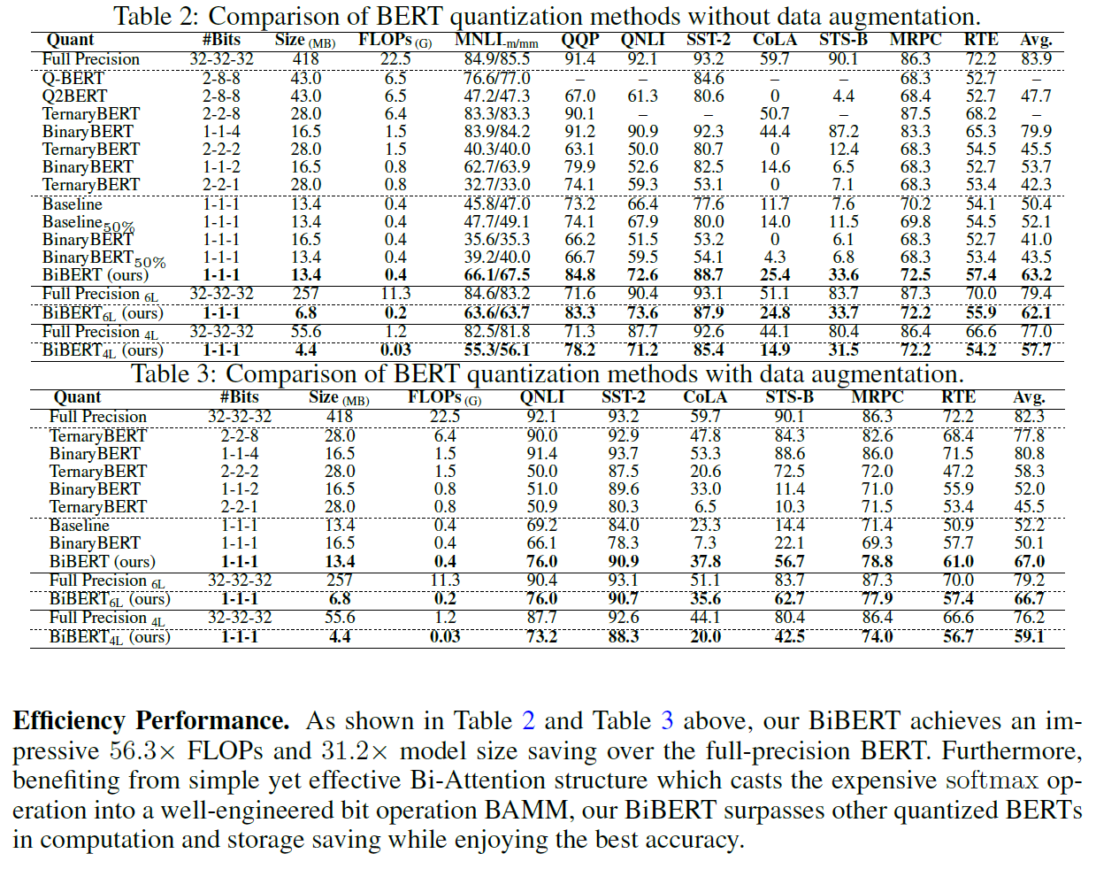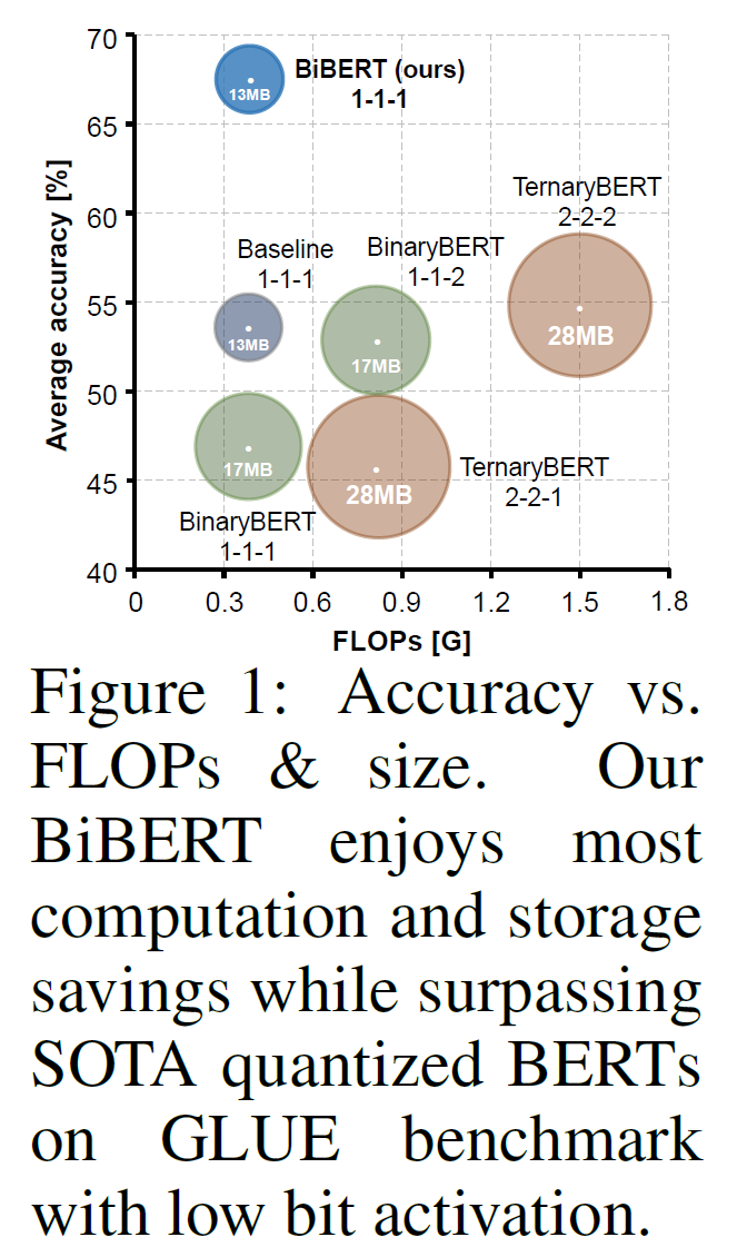 - 또한, 우리의 BiBERT는 FLOPs와 모델 크기에서 각각 56.3배와 31.2배의 인상적인 절약을 제공함으로써, 실제 세계의 자원 제약 시나리오에서 완전 이진화된 BERT 모델의 엄청난 이점과 잠재력을 보여줍니다(Figure 1 참조).