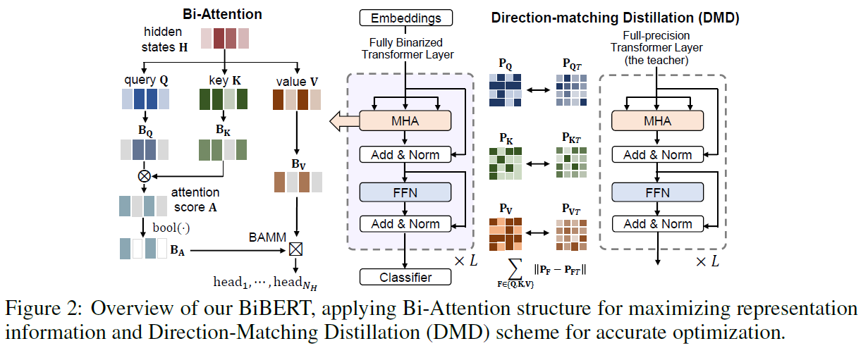 - BiBERT는 표현 정보를 통계적으로 최대화하기 위한 효율적인 Bi-Attention 구조와 완전한 이진화된 BERT를 정확하게 최적화하기 위한 Direction-Matching Distillation (DMD) 체계를 도입합니다.