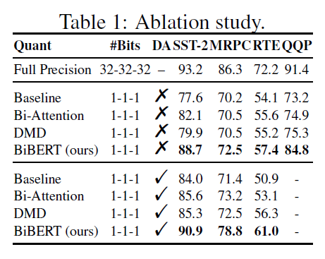 - 그런 다음 BiBERT에서 성능을 향상시키기 위해 Bi-Attention과 DMD를 제안합니다.