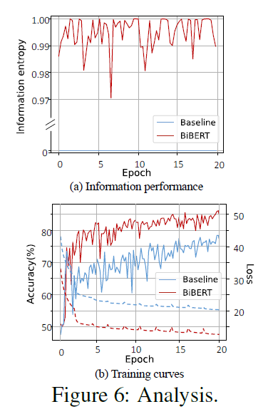 - 훈련 과정 동안 BiBERT의 attention 가중치의 정보 엔트로피는 작은 범위에서 흔들리며 거의 최대화되지만, 기준 모델의 경우 완전히 0으로 저하됩니다.