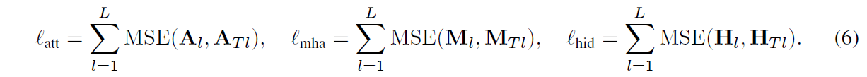 - 일반적인 관행은 전체 정밀도 교사 네트워크에서 attention 점수 ATl, MHA 출력 MTl, 그리고 숨겨진 상태 HTl를 계층별로 정제하고, 이진화된 학생 대응물, 즉 Al, Ml, Hl (l = 1, ..., L, 여기서 L은 변환기 계층의 수를 나타냅니다)로 전송하는 것입니다.