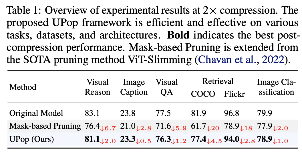 - 다중 모달 프루닝: UPop은 단일 프레임워크 내에서 다른 모달리티(예: 시각과 언어)를 압축하는 도전을 해결합니다. 이는 다양한 구성 요소와 모달리티에 걸쳐 압축 비율을 적응적으로 할당하는 통합 접근 방식을 제안합니다.