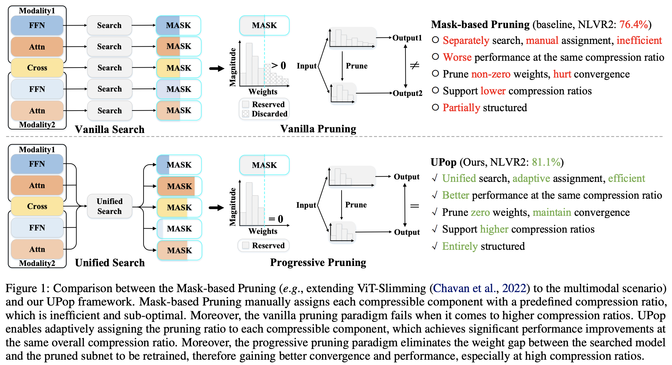 - 제안된 해결책: 저자들은 Unified and Progressive Pruning (UPop)이라는 새로운 다중 모달 프루닝 프레임워크를 소개합니다. 이 프레임워크는 기존 방법의 비효율성을 해결하고 성능 저하 없이 높은 압축 비율을 지원하는 것을 목표로 합니다.
