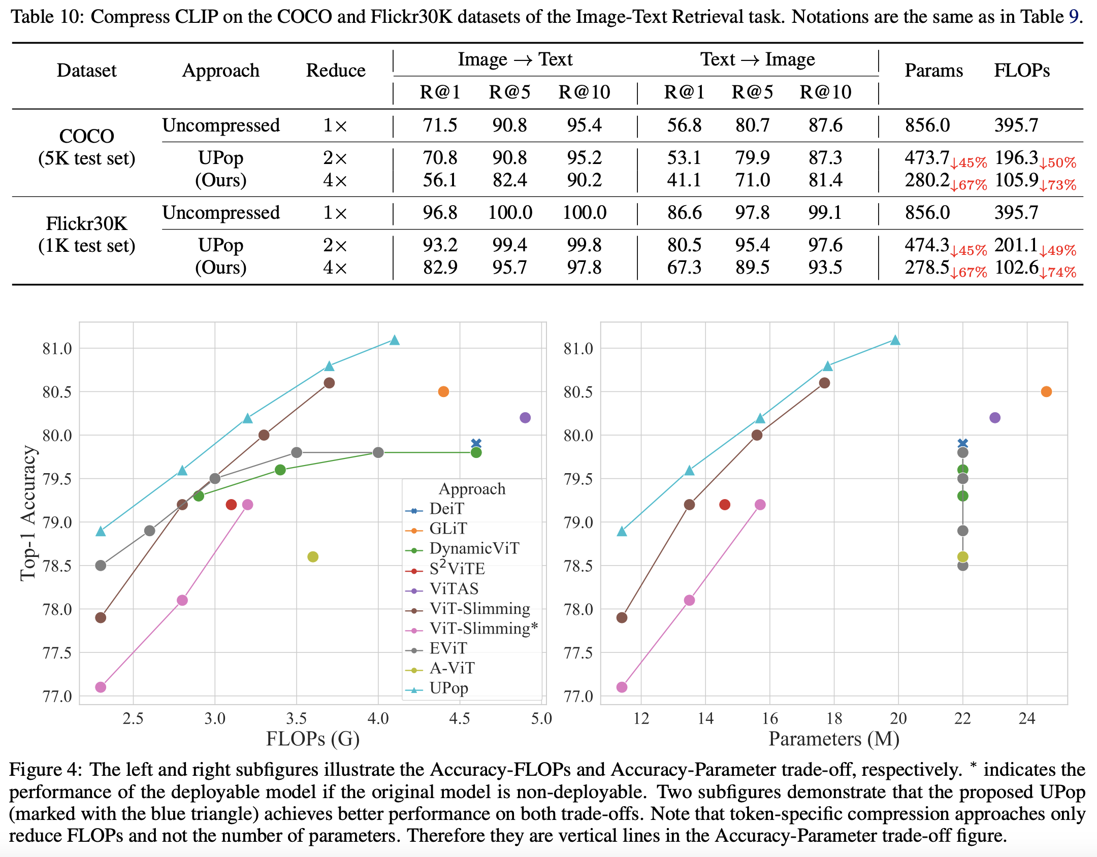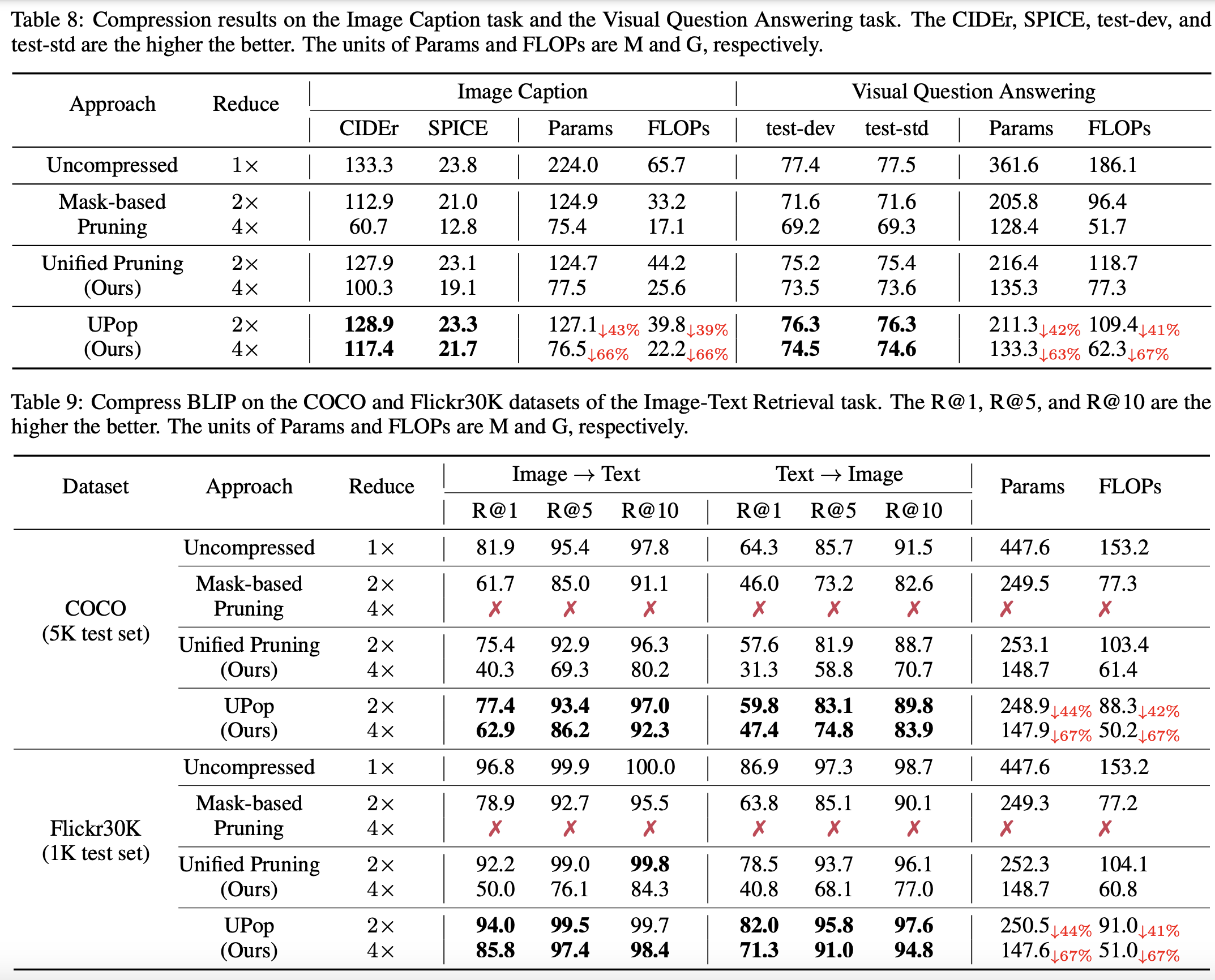 - 비교 분석: 결과는 높은 압축 비율에 적응하고 성능을 유지하는 면에서 UPop이 전통적인 방법보다 우수함을 보여줍니다.