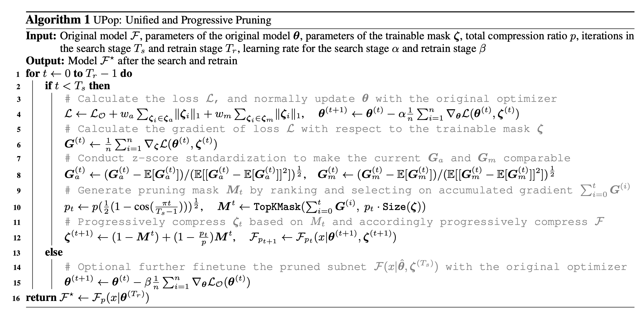 - 진보적 프루닝 패러다임: 논문은 높은 압축 비율에서 비효율적인 전통적인 두 단계 프루닝(검색 후 재훈련)을 비판합니다. UPop은 검색과 재훈련이 동시에 이루어지는 진보적 프루닝 방법을 도입하여 더 부드러운 수렴과 더 나은 성능을 가능하게 합니다.