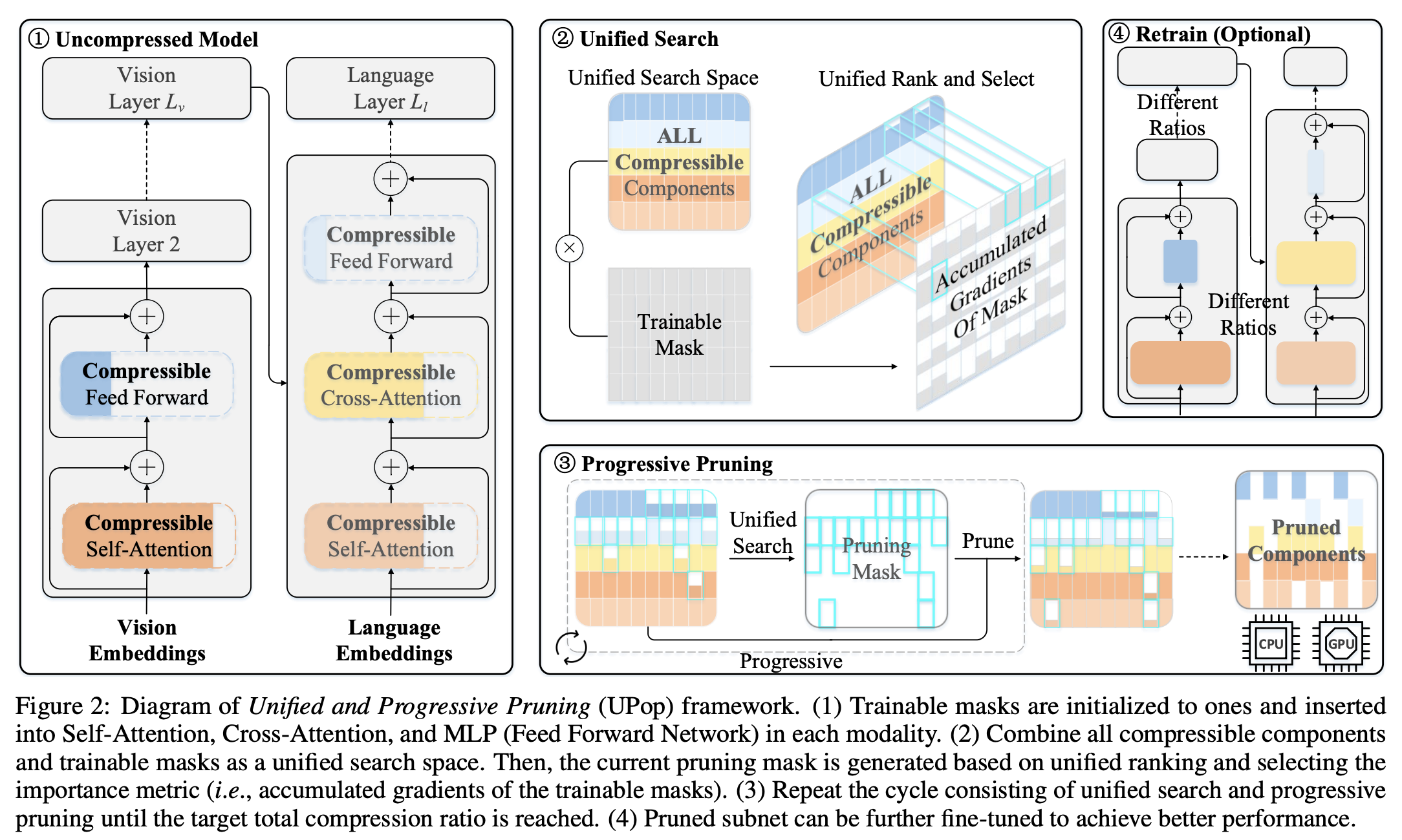 - 제안된 해결책: 저자들은 Unified and Progressive Pruning (UPop)이라는 새로운 다중 모달 프루닝 프레임워크를 소개합니다. 이 프레임워크는 기존 방법의 비효율성을 해결하고 성능 저하 없이 높은 압축 비율을 지원하는 것을 목표로 합니다.