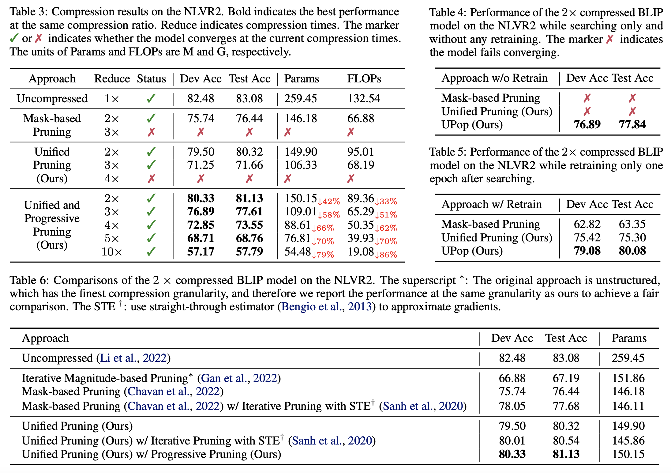 - 다중 모달 프루닝: UPop은 단일 프레임워크 내에서 다른 모달리티(예: 시각과 언어)를 압축하는 도전을 해결합니다. 이는 다양한 구성 요소와 모달리티에 걸쳐 압축 비율을 적응적으로 할당하는 통합 접근 방식을 제안합니다.